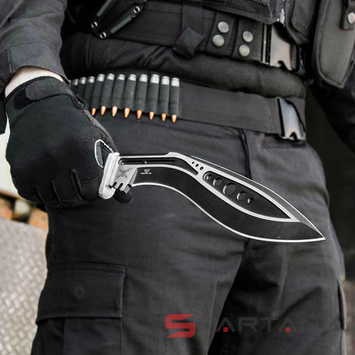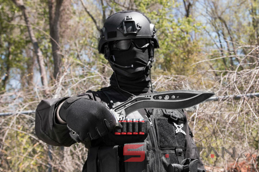 Внушительный нож с огромным клинком переменной ширины, с толщиной обуха 7.5 mm. Для снижения веса в клинке проделаны отверстия. Предательские блески не выдадут Вас - клинок имеет чёрное матовое покрытие. Центр тяжести смещен ближе к острию клинка, за счет его переменной ширины, что способствует эффективным рубящим ударам.