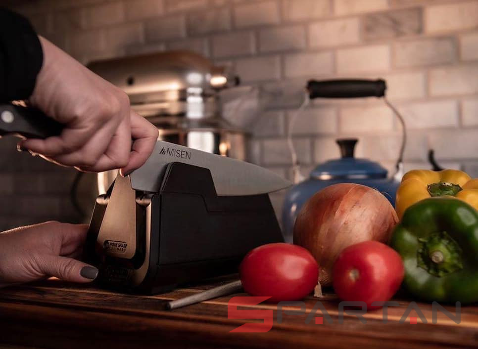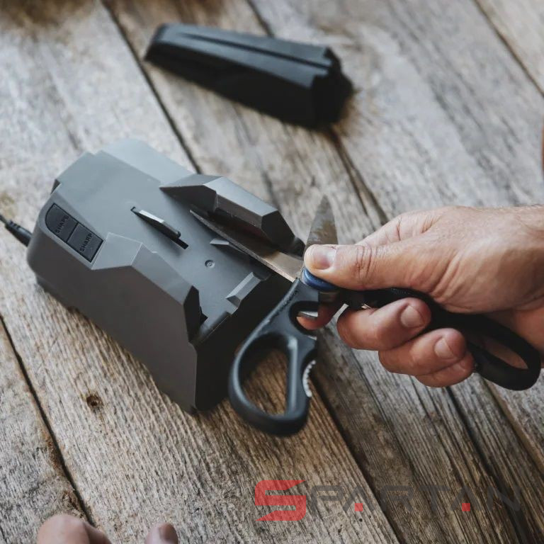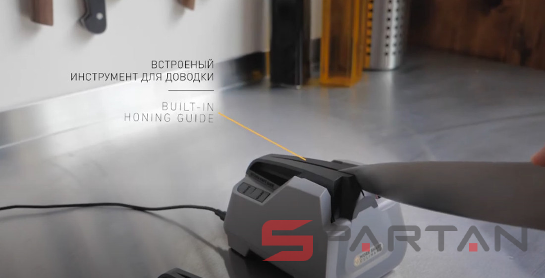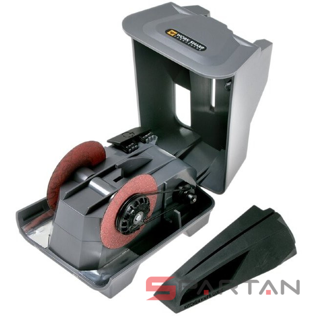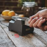 Электрическая точилка для кухонных ножей и ножниц от именитого американского производителя. Очень удобная и простая в использовании, с ней справится любая хозяйка. Небольшие габариты позволяют хранить её в стандартном выдвижном кухонном ящике. Всё что требуется это нажать единственную клавишу включения, положить нож в правую направляющую и медленно протянуть (без нажима) на себя несколько раз. Потом произвести такую же процедуру в левой направляющей. Автоматический таймер не даст "переточить" нож, отключив точилку когда клинок будет заточен достаточно. В центре расположен слот с керамическим камнем для окончательной шлифовки (доводки) режущей кромки. По нему с лёгким давлением следует провести ножом вперед/назад по всей длине режущей кромки 10 раз.